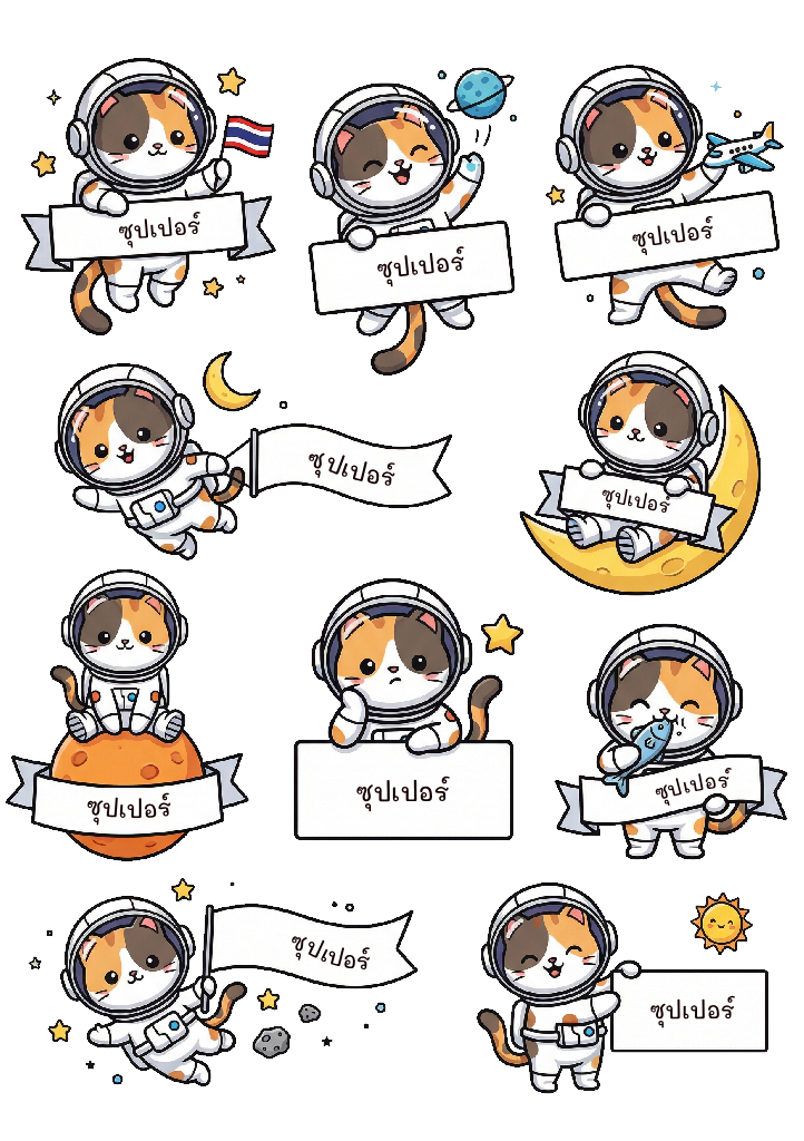 แมวสามสีสุดขี้เล่นในชุดนักบินอวกาศ ที่ออกผจญภัยในจักรวาลแฟนตาซีอย่างสนุกสนาน ไม่ว่าจะเป็นการนั่งบนดาวเคราะห์ โบกธงไทย ขี่จรวด กอดปลา หรือเล่นกับดาวและเอเลี่ยน ทุกตัวละครมีท่าทางน่ารักและมีพื้นที่สำหรับใส่ชื่อในกรอบป้าย เหมาะสำหรับตกแต่งของใช้ส่วนตัว เช่น ขวดน้ำ กล่องข้าว เคสมือถือ หรือสมุดโน้ต ใช้เป็นของขวัญหรือของชำร่วยในโอกาสพิเศษ จุดเด่นคือสามารถใส่ชื่อในกรอบป้ายได้ เพิ่มความน่ารักและความหมายเฉพาะตัวให้กับชิ้นงาน สติกเกอร์มีคุณสมบัติกันน้ำ ทนทาน สีสดใส และผิวสัมผัสเงางาม เหมาะสำหรับงาน DIY และของขวัญที่ต้องการความพิเศษในธีมแมวอวกาศขี้เล่น