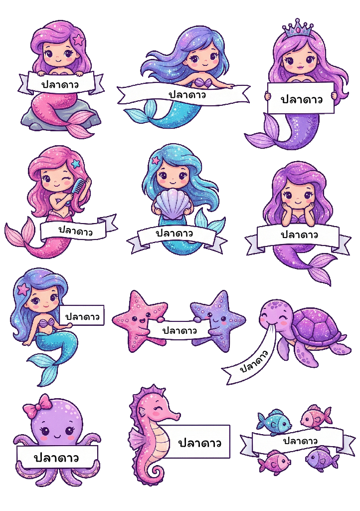 รวมเหล่านางเงือกน้อยผมหลากสีและสัตว์ทะเลสุดน่ารัก เช่น ปลาดาว เต่า ม้าน้ำ ปลาหมึก และปลาน้อย มาพร้อมโทนสีสดใสสไตล์แฟนตาซีใต้น้ำ จุดเด่นคือกรอบป้ายที่สามารถใส่ชื่อได้ ทำให้สติกเกอร์แต่ละชิ้นมีความหมายเฉพาะตัวและไม่ซ้ำใคร เหมาะสำหรับตกแต่งของใช้ส่วนตัว เช่น กล่องข้าว ขวดน้ำ เคสมือถือ สมุดโน้ต หรือใช้เป็นของขวัญและของชำร่วยในโอกาสพิเศษ สติกเกอร์ผลิตด้วยเทคนิค UV DTF คุณภาพสูง กันน้ำ ทนทาน สีสดคมชัด และผิวสัมผัสเงางาม เหมาะสำหรับงาน DIY และผู้ที่ชื่นชอบธีมโลกใต้ทะเลแฟนตาซีที่สามารถปรับแต่งได้ตามใจ