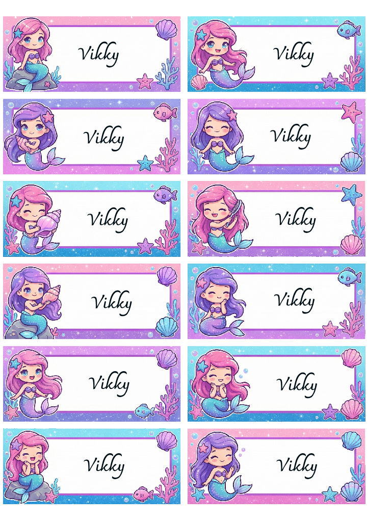 นางเงือกน้อยในหลากหลายท่วงท่าและสีผมสดใส พร้อมกรอบป้ายที่ออกแบบมาโดยเฉพาะสำหรับ ใส่ชื่อได้ เพิ่มความพิเศษและความหมายเฉพาะตัวให้กับสติกเกอร์ เหมาะสำหรับตกแต่งของใช้ส่วนตัว เช่น กล่องข้าว ขวดน้ำ เคสมือถือ สมุดโน้ต หรือใช้เป็นของขวัญและของชำร่วยในโอกาสพิเศษ ดีไซน์โทนสีพาสเทลประกายระยิบระยับ ให้บรรยากาศแฟนตาซีใต้น้ำที่เต็มไปด้วยความสนุกสนานและความน่ารัก สติกเกอร์ผลิตด้วยเทคนิค UV DTF คุณภาพสูง กันน้ำ ทนทาน สีสดคมชัด และผิวสัมผัสเงางาม เหมาะสำหรับงาน DIY และผู้ที่ชื่นชอบธีมโลกใต้ทะเลแฟนตาซีที่สามารถปรับแต่งได้ตามใจ