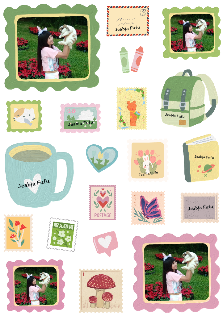 สติกเกอร์ UV DTF ดีไซน์คอลลาจแสตมป์สุดแฟนซีน่ารัก ผสมผสานภาพถ่ายกับภาพวาดของใช้ประจำวัน เช่น กระเป๋า แก้วกาแฟ หนังสือ พร้อมลวดลายแสตมป์สัตว์ ดอกไม้ เห็ด และหัวใจ เหมาะสำหรับตกแต่งของใช้ส่วนตัว เช่น สมุดโน้ต กล่องข้าว เคสมือถือ หรือของขวัญ DIY จุดเด่นคือสามารถใส่รูปภาพลงในกรอบแสตมป์ได้ ใส่ชื่อได้ เพิ่มความน่ารักและความหมายเฉพาะตัวให้กับชิ้นงาน สติกเกอร์มีคุณสมบัติกันน้ำ ทนทาน สีสดใส และผิวสัมผัสเงางาม เหมาะสำหรับงานฝีมือและของขวัญที่ต้องการความพิเศษ