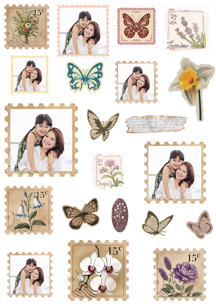 ดีไซน์แสตมป์ดอกไม้และผีเสื้อสไตล์วินเทจ ผสมผสานความละมุนของภาพวาดพฤกษศาสตร์กับความสดใสขององค์ประกอบตกแต่ง เช่น หนังสือเปิด วงรีลายดาว และกรอบแสตมป์หลากสี เหมาะสำหรับตกแต่งของใช้ส่วนตัว เช่น ขวดน้ำ กล่องข้าว เคสมือถือ หรือสมุดโน้ต ใช้เป็นของขวัญหรือของชำร่วยในโอกาสพิเศษ จุดเด่นคือสามารถใส่รูปภาพลงในกรอบแสตมป์ได้ เพิ่มความน่ารักและความหมายเฉพาะตัวให้กับชิ้นงาน สติกเกอร์มีคุณสมบัติกันน้ำ ทนทาน สีสดใส และผิวสัมผัสเงางาม เหมาะสำหรับงาน DIY และของขวัญที่ต้องการความพิเศษในสไตล์ธรรมชาติและวินเทจ