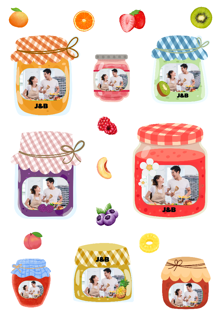 สติกเกอร์ UV DTF ขนาด A5 ในธีม “Fruit Jam Frame” ที่รวมขวดแยมหลากรสพร้อมฝาลายโบว์และลายผ้าตารางสุดน่ารัก ตกแต่งด้วยผลไม้สดใส เช่น สตรอว์เบอร์รี กีวี ส้ม และบลูเบอร์รี กันน้ำ ทนต่อการขูดขีด ไม่ลอกง่าย Customize ได้ ใส่ชื่อและรูปได้ เหมาะสำหรับตกแต่งของใช้ เช่น กล่องขนม เคสมือถือ โน๊ตบุ๊ค สมุด หรือของขวัญ
