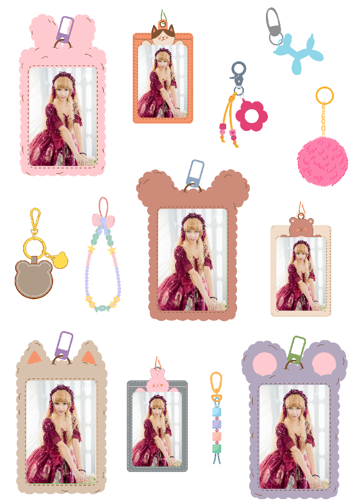 สติกเกอร์ UV DTF ขนาด A5 ยืดหยุ่นนูนสวยในธีม “Kawaii Keychain Frame” ที่รวมกรอบรูปสุดน่ารักพร้อมดีไซน์หูสัตว์หลากสี เช่น หมี กระต่าย แมว และพวงกุญแจตกแต่ง เช่น โบว์ ฟลัฟฟี่ ปอมปอม ดอกไม้ และลูกปัด กันน้ำ ทนต่อการขูดขีด ไม่ลอกง่าย