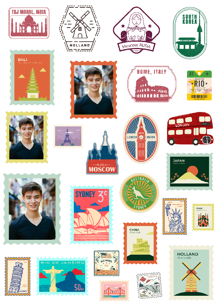 ดีไซน์แสตมป์นานาชาติที่รวมแลนด์มาร์กและสัญลักษณ์จากหลากหลายประเทศ เช่น หอไอเฟล โคลอสเซียม วัดไทย ภูเขาไฟฟูจิ ตึกเบน ลานโคมบาหลี และเทพีเสรีภาพ เหมาะสำหรับตกแต่งของใช้ส่วนตัว เช่น ขวดน้ำ กล่องข้าว เคสมือถือ หรือสมุดโน้ต ใช้เป็นของขวัญหรือของชำร่วยในโอกาสพิเศษ จุดเด่นคือสามารถใส่ชื่อและรูปภาพลงในกรอบแสตมป์หรือองค์ประกอบตกแต่งได้ เพิ่มความน่ารักและความหมายเฉพาะตัวให้กับชิ้นงาน สติกเกอร์มีคุณสมบัติกันน้ำ ทนทาน สีสดใส และผิวสัมผัสเงางาม เหมาะสำหรับงาน DIY และของขวัญที่ต้องการความพิเศษในธีมการเดินทางรอบโลก