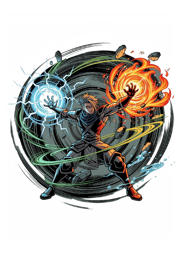 เสื้อยืดลายนักรบพลังธาตุคู่: ไฟและสายฟ้า