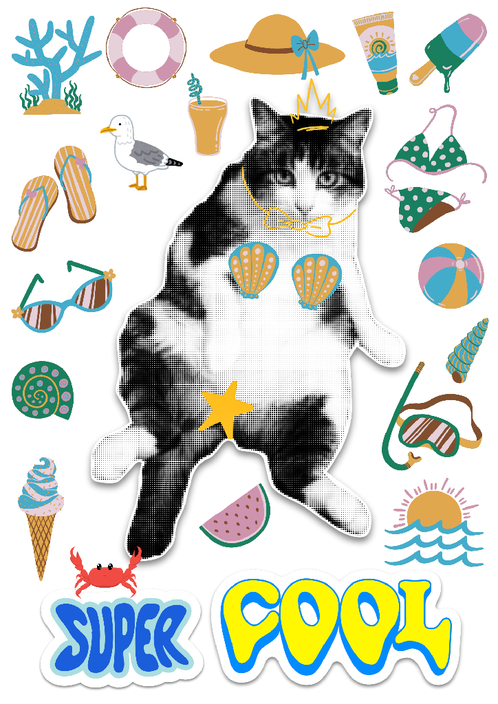 เติมความสดใสให้ซัมเมอร์นี้ด้วยเสื้อยืดลายกราฟิกแมวสุดกวนในธีม “Super Cool” ที่ไม่เหมือนใคร ดีไซน์อัดแน่นไปด้วยไอเทมหน้าร้อนทั้งห่วงยาง แว่นตา และไอศกรีมสีสันสดใส โดดเด่นด้วยน้องแมวขาวดำสไตล์ฮาล์ฟโทนสุดคลาสสิกที่นอนชิลอยู่กลางภาพ เนื้อผ้าคุณภาพดี สวมใส่สบาย ระบายอากาศได้เยี่ยม เหมาะกับอากาศเมืองไทย พิมพ์ลายด้วยเทคโนโลยีทันสมัยให้สีสวยคมชัดติดทนนาน เหมาะสำหรับใส่ไปเที่ยวทะเล เดินชายหาด หรือเป็นของขวัญสุดน่ารักสำหรับทาสแมว สินค้าพร้อมส่งมอบความเท่ในแบบฉบับที่ไม่ซ้ำใครให้กับคุณ