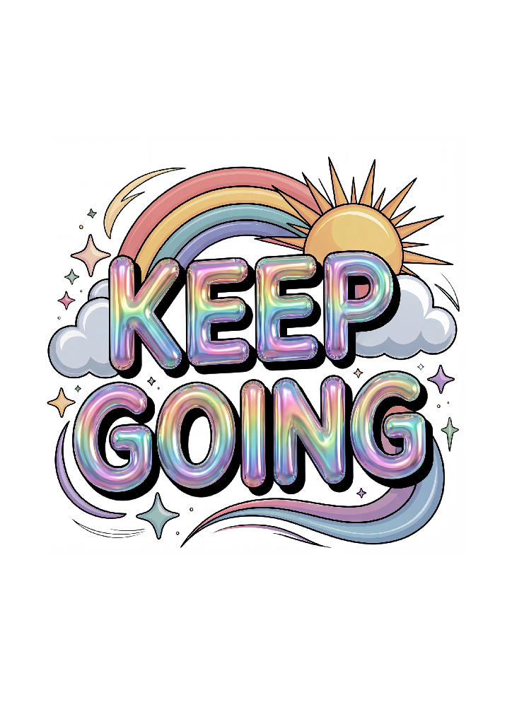 เพิ่มพลังบวกให้กับทุกวันของคุณด้วยเสื้อยืดลาย “Keep Going” ดีไซน์สุดน่ารักและทันสมัย โดดเด่นด้วยตัวอักษรแบบลูกโป่ง 3 มิติสีโฮโลแกรมเหลือบมุกที่ดูมีมิติสวยงาม มาพร้อมกับองค์ประกอบน่ารักๆ อย่างสายรุ้งพาสเทล ก้อนเมฆ และดวงอาทิตย์ที่ให้ความรู้สึกอบอุ่นและมีความหวัง งานพิมพ์กราฟิกคมชัดสีสันสดใสบนเนื้อผ้าคุณภาพดีที่สวมใส่สบายตลอดวัน เหมาะสำหรับใส่แมตช์กับกางเกงยีนส์ในวันสบายๆ หรือใส่ไปเที่ยวคาเฟ่เก๋ๆ ก็ดูดีมีสไตล์ ดีไซน์สำเร็จรูปนี้พร้อมส่งต่อกำลังใจดีๆ ให้คุณและคนที่คุณรักได้ทันที