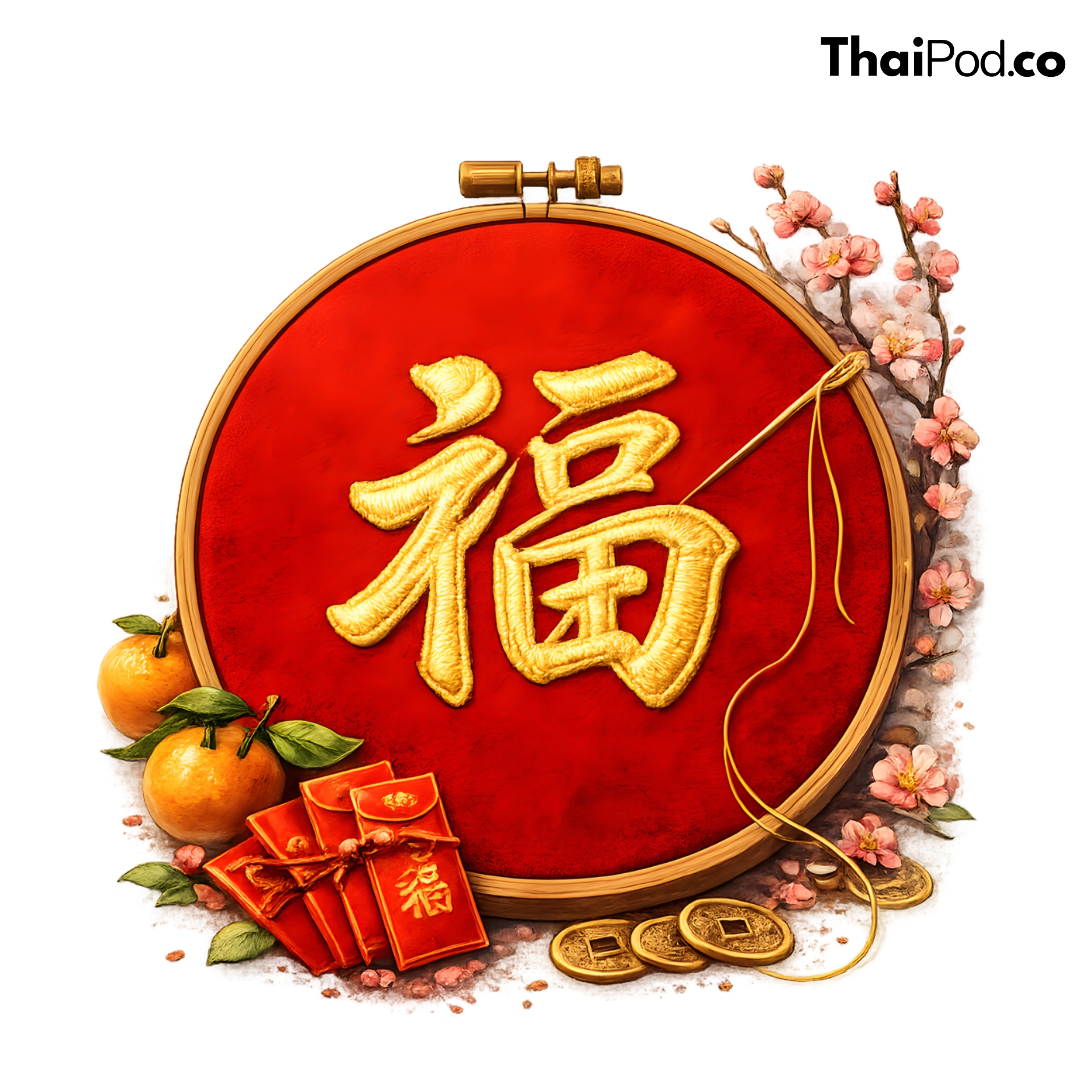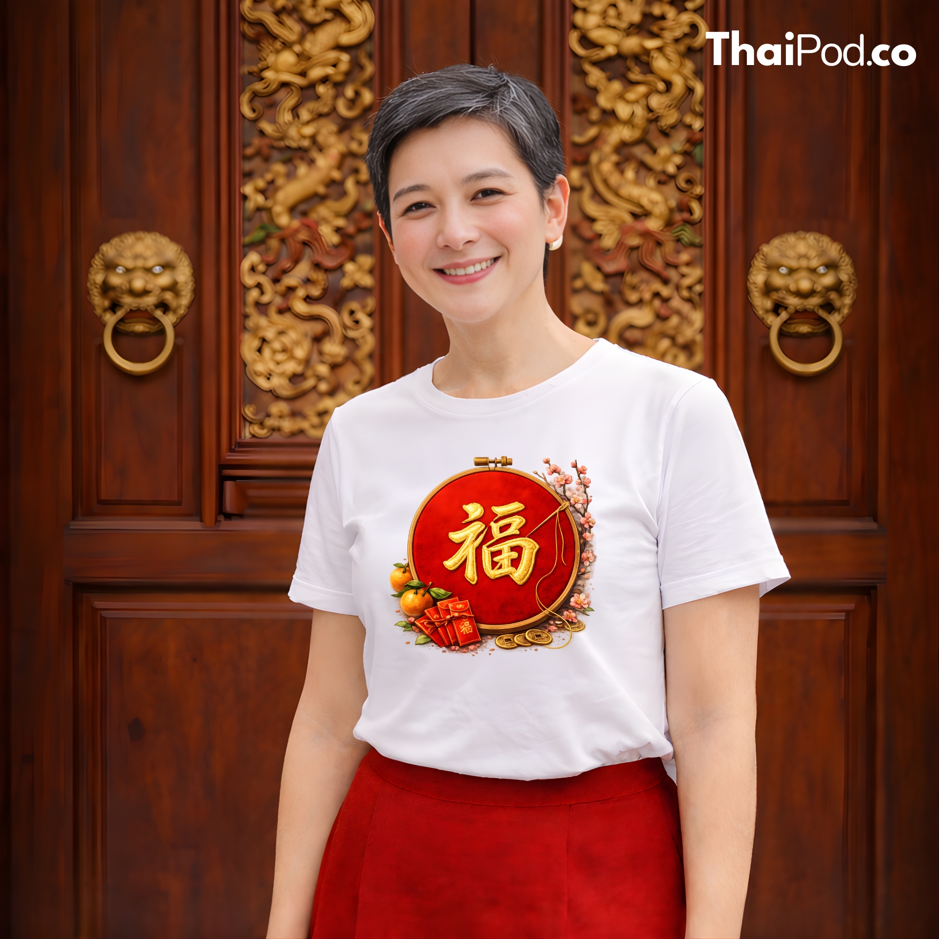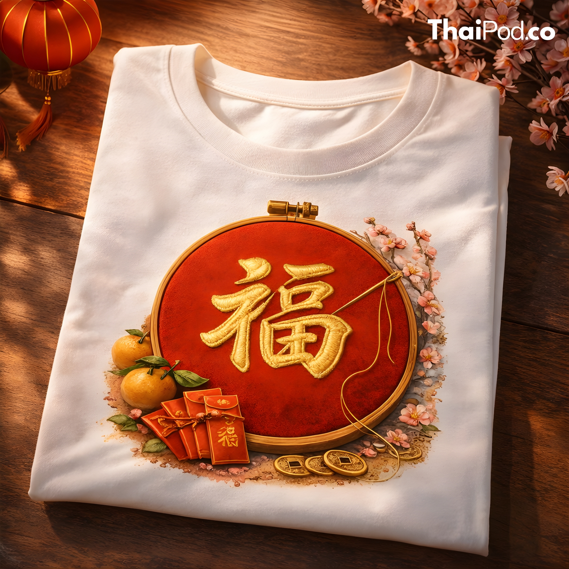 ต้อนรับเทศกาลตรุษจีนด้วยเสื้อยืดลายมงคลที่ดีไซน์มาอย่างประณีตงดงาม โดดเด่นด้วยลายกราฟิกสะดึงปักอักษรจีน “ฮก” (Fu) สีทองอร่ามบนพื้นแดง ซึ่งสื่อความหมายถึงความโชคดีและความสุขสมหวัง รายล้อมด้วยสัญลักษณ์แห่งความมั่งคั่งทั้งส้มมงคล ซองอั่งเปา และเหรียญจีนโบราณ เพิ่มความอ่อนช้อยด้วยกิ่งดอกเหมยที่กำลังผลิบานสวยงาม งานพิมพ์มีความคมชัดสูง ถ่ายทอดรายละเอียด Texture ของเส้นด้ายปักได้เสมือนจริงมาก เหมาะสำหรับสวมใส่เพื่อเสริมสิริมงคลหรือมอบเป็นของขวัญที่มีความหมายดีเยี่ยม ไม่ว่าจะใส่ไปไหว้เจ้าหรือรวมญาติก็ดูดีและมีสไตล์